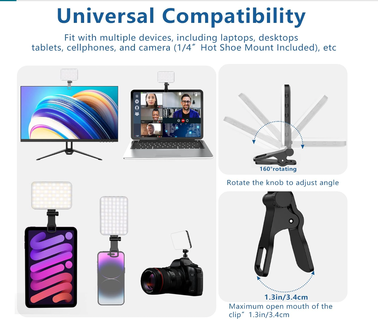 Esta luz LED portátil con clip y adaptador para trípode ofrece una iluminación profesional gracias a sus 60 LEDs y un alto índice de reproducción cromática (CRI) de 97+, ideal para maquillaje, videoconferencias, vlogging y fotografía. Cuenta con 3 modos de luz (blanco, natural y cálido) y 10 niveles de brillo que permiten ajustar la temperatura de color entre 2500 y 6500K, adaptándose a cualquier ambiente. Su batería recargable de 2200 mAh garantiza autonomía para largas sesiones, mientras su diseño delgado y ligero facilita su uso en cámaras y dispositivos móviles.