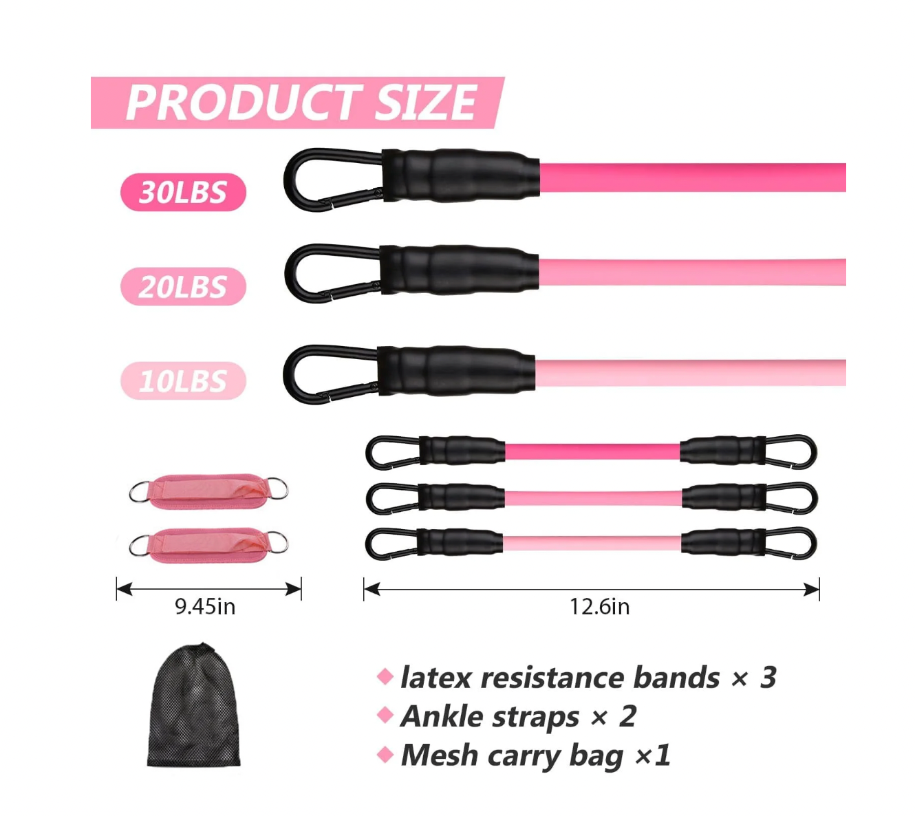 Este equipo de entrenamiento para piernas y glúteos incluye tobilleras acolchadas con esponja 100% de alta calidad y neopreno que garantizan comodidad y seguridad durante el uso. Cuenta con tres bandas de resistencia fabricadas en látex natural 100%, ofreciendo niveles de 10, 20 y 30 lb para adaptarse a diferentes rutinas y objetivos. Las bandas pueden usarse individualmente o combinadas para ajustar la intensidad del ejercicio. Además, el set es ligero y portátil, facilitando su transporte gracias a la bolsa incluida, ideal para entrenar en cualquier lugar con profesionalismo y eficacia.