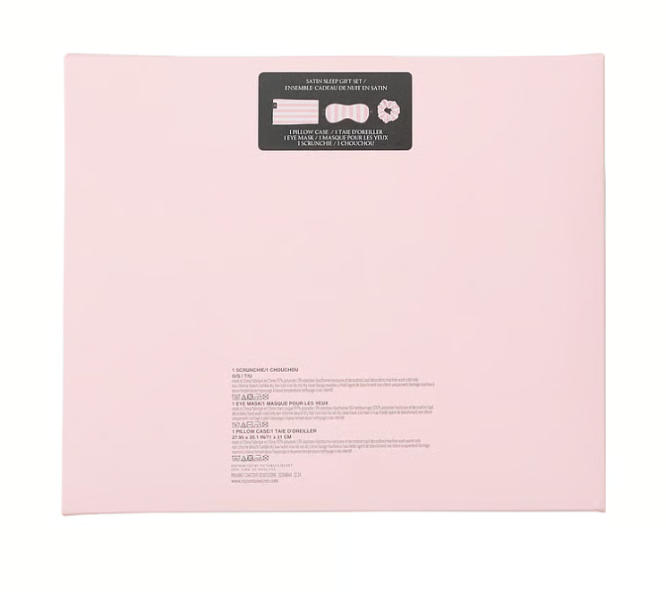 Disfruta de un descanso óptimo con este set de regalo satinado de Victoria's Secret. Incluye antifaz, goma para el pelo y funda de almohada en un elegante estampado de rayas, que protegen tu piel y cabello mientras duermes. Ideal para quienes valoran el confort y la sofisticación en su rutina nocturna.