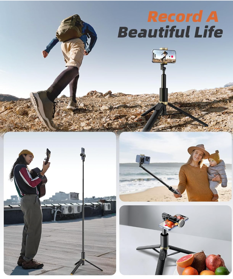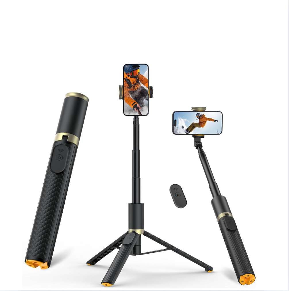 El trípode de teléfono y palo para selfie Vimose combina funcionalidad y portabilidad en un solo diseño compacto. Se pliega a apenas 12.5 pulgadas, facilitando su transporte para viajes y uso diario. Con una altura ajustable de hasta 62 pulgadas y un soporte giratorio de 360°, permite capturar imágenes amplias y desde múltiples ángulos con precisión profesional, adaptándose a diversas situaciones para garantizar cada toma perfecta.